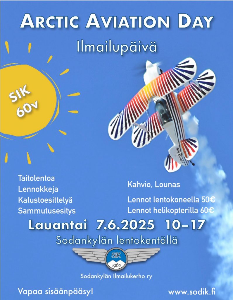 Tervetuloa tutustumaan moottori- ja purjekonelentämiseen Sodankylän lentokentälle lauantaina 3.8.2024 klo 11-17. Toteutamme esittelylentoja päivän aikana.